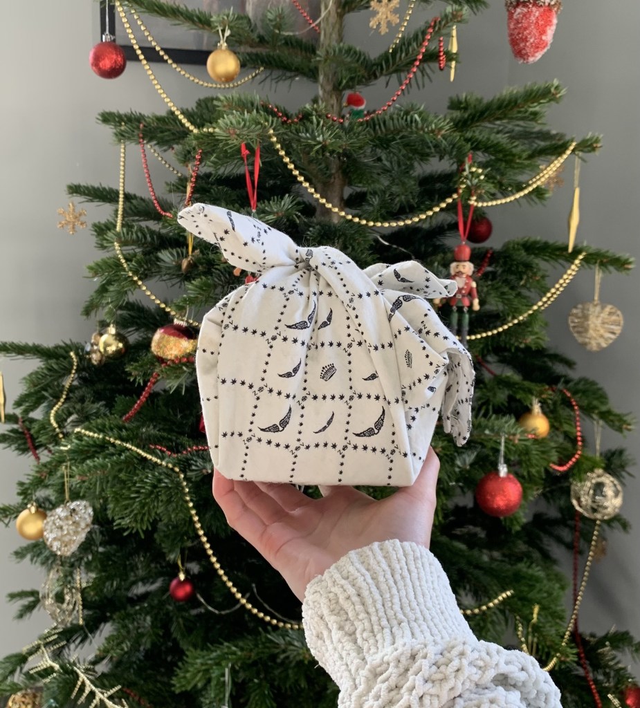 Le furo-quoi? Le furoshiki, ma petite dame! C’est une technique japonaise d’emballage de cadeau, ou d’objets car au Japon on s’en sert aussi pour transporter ses affaires, à partir d’un carré de tissu. Cette. technique d’emballage cadeau zéro déchet s’est largement démocratisée ces dernières années, en particulier sur les réseaux sociaux dans les sphères écologiques, grâce à son côté élégant et réutilisable.