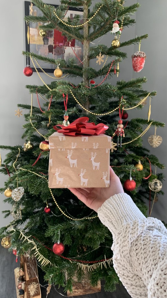 On peut penser à des boîtes en métal ou en bois aux motifs de Noël comme on en trouve beaucoup dans les commerces à cette période ou bien dans les ressourceries! Tu peux regarder du côté de Label Emmaüs et bien sûr dans les enseignes physiques près de chez toi. On peut aussi créer son emballage réutilisable soi-même en faisant de la récup comme sur cette photo. Pour cela il te faudra choisir une boîte en carton avec un couvercle et emballer les deux parties séparément. Comme ça pour ouvrir le paquet on aura juste à soulever le couvercle, pas besoin de tout déchirer. C’est l’option qui se rapproche le plus des emballages traditionnels tout en étant plus écologique grâce à son aspect réutilisable.